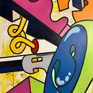 Pairing tubism geometry with the raw the energy of graffiti in bold, vibrant compositions, the works channel the rhythm of the street and the precision of abstraction—each piece a joyful collision of culture and color.